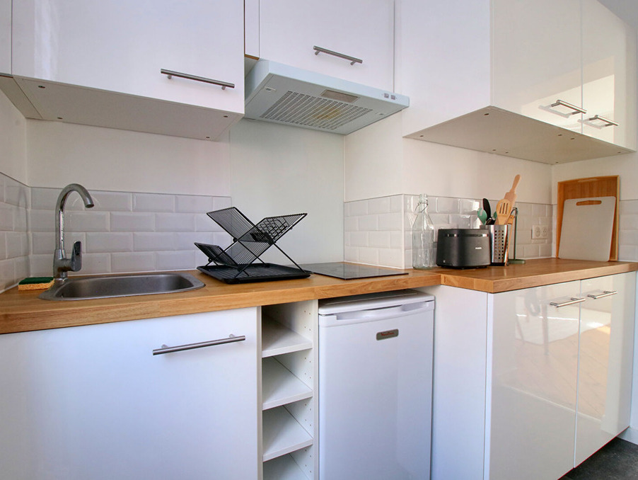 L'appartement de 20m² comprend une pièce principale, une cuisine séparée et entièrement équipée, une salle de douche avec WC.